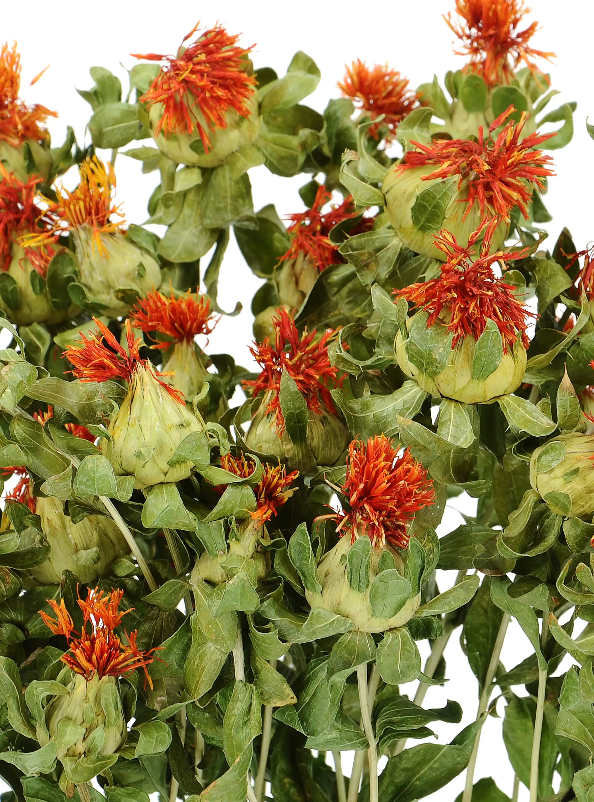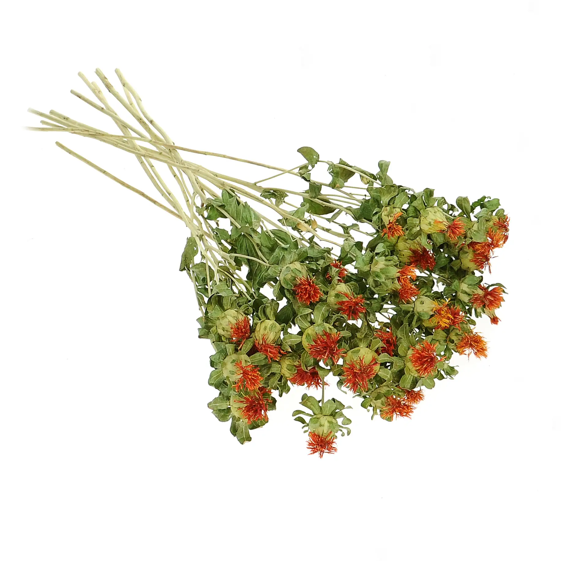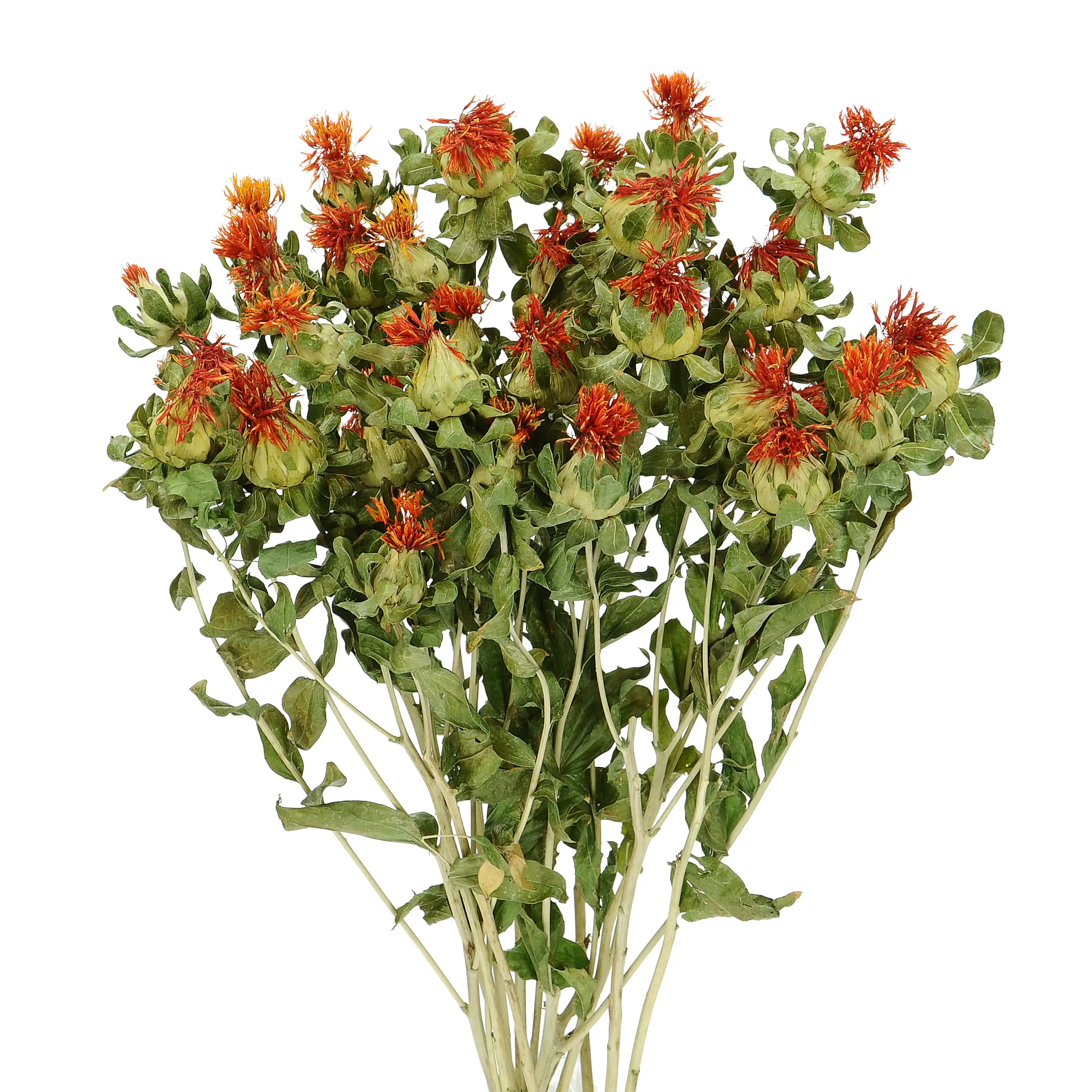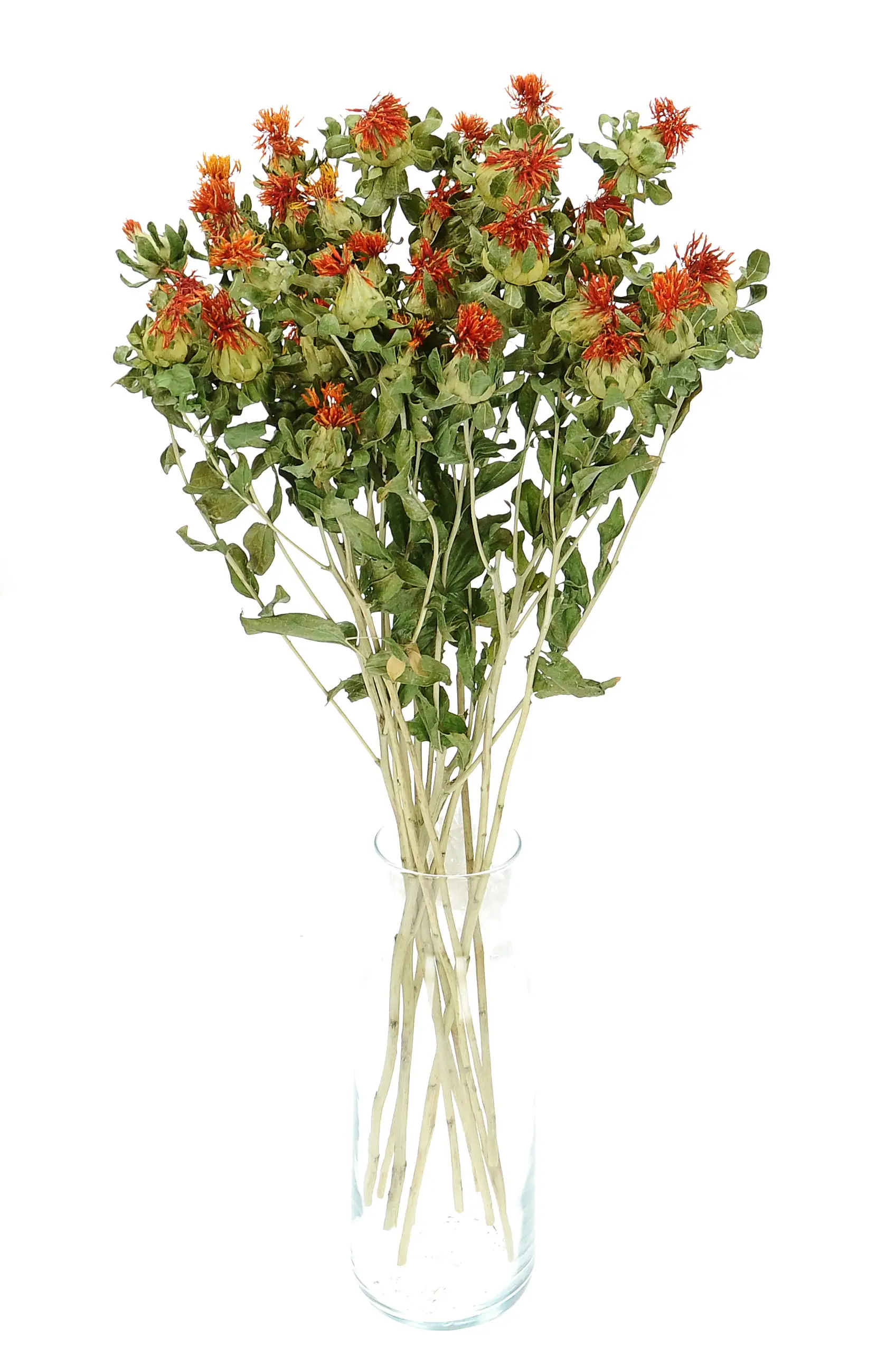 Carthamus tinctorius - Die Färberdistel, die in Polen auch Cartamus genannt wird, ist eine Pflanze aus der Familie der Korbblütler. Färberdistel hat kopfartige Blütenstände mit orangefarbenen Röhrenblüten. In ihrer getrockneten Form wird sie vor der Vollblüte geerntet, so dass die meisten Stängel die Blütenstände im geschlossenen Stadium aufweisen. Getrocknete Färberdisteln eignen sich hervorragend als Füllung oder Ergänzung für rustikale Blumensträuße.