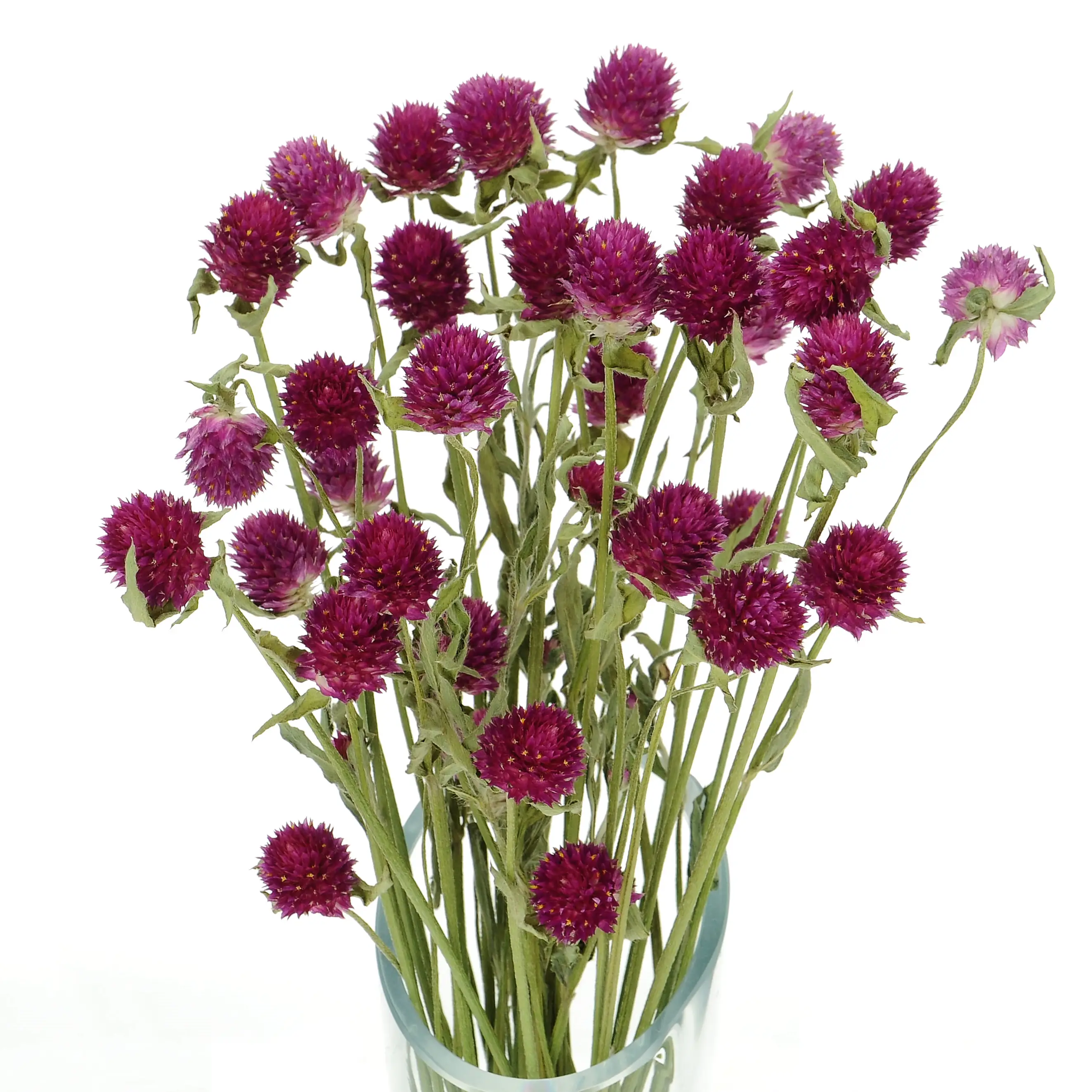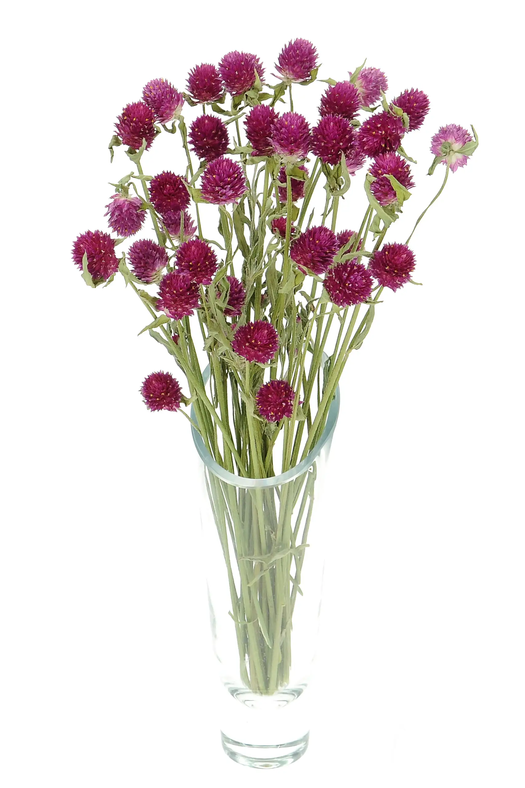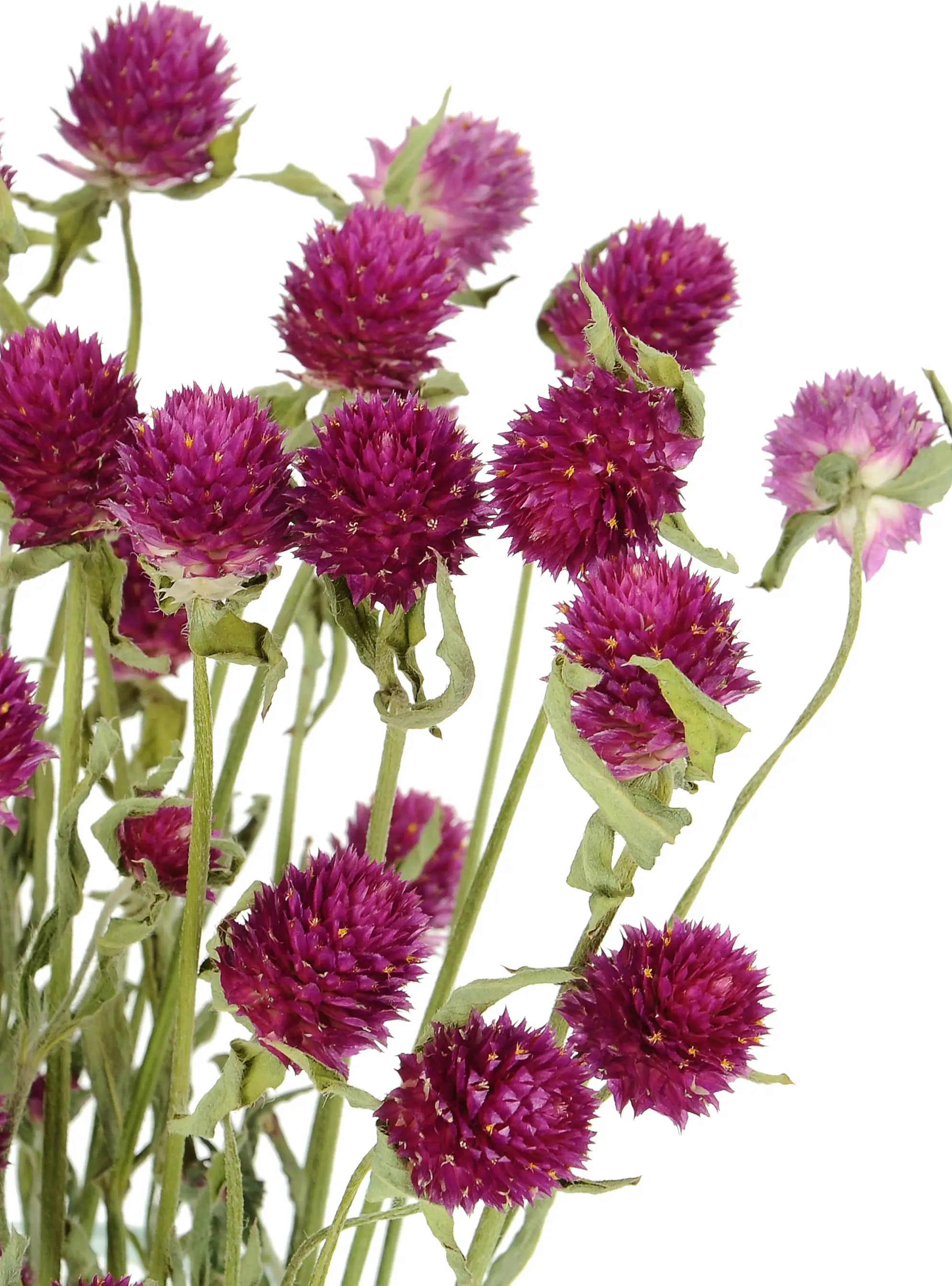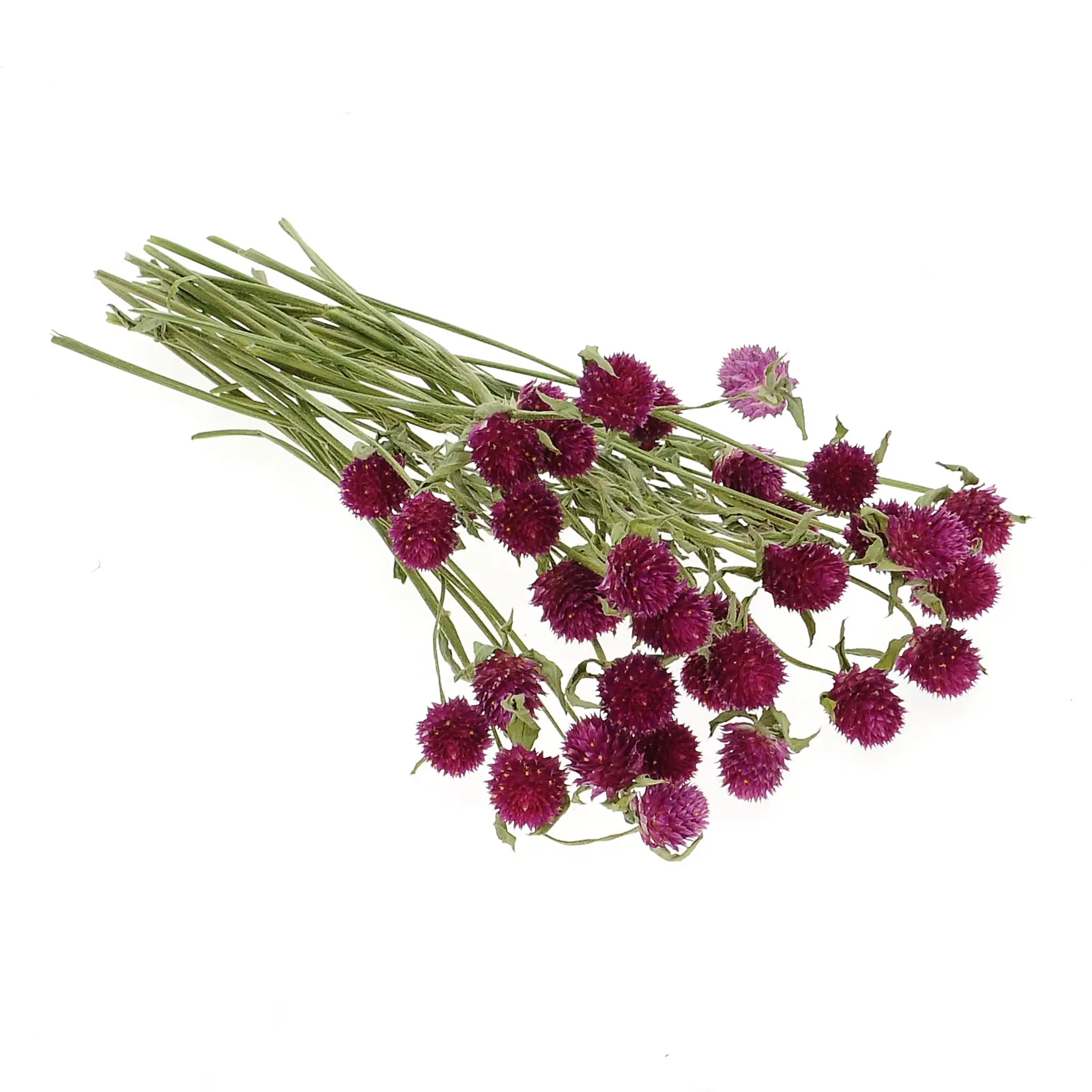 Gomphrena globosa - ein Strauß von Gomphrena polnischer Herkunft mit kugelförmigen Blüten in einer natürlichen Farbe von schmutzigem Rosa. Die getrockneten Nachtkerzen eignen sich gut für Trockensträuße, Girlanden, Ständer und Blumengirlanden.