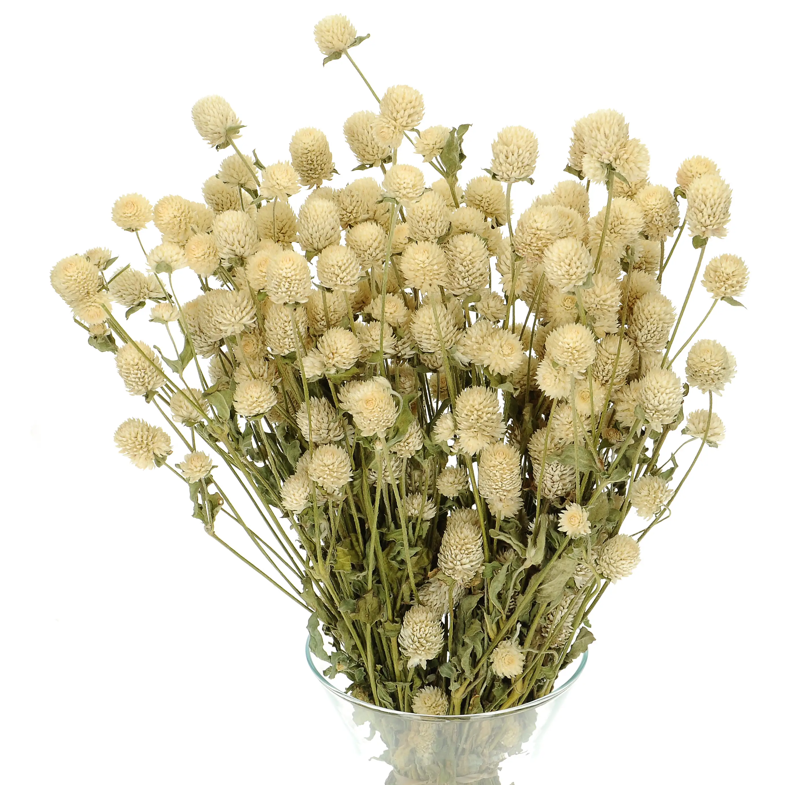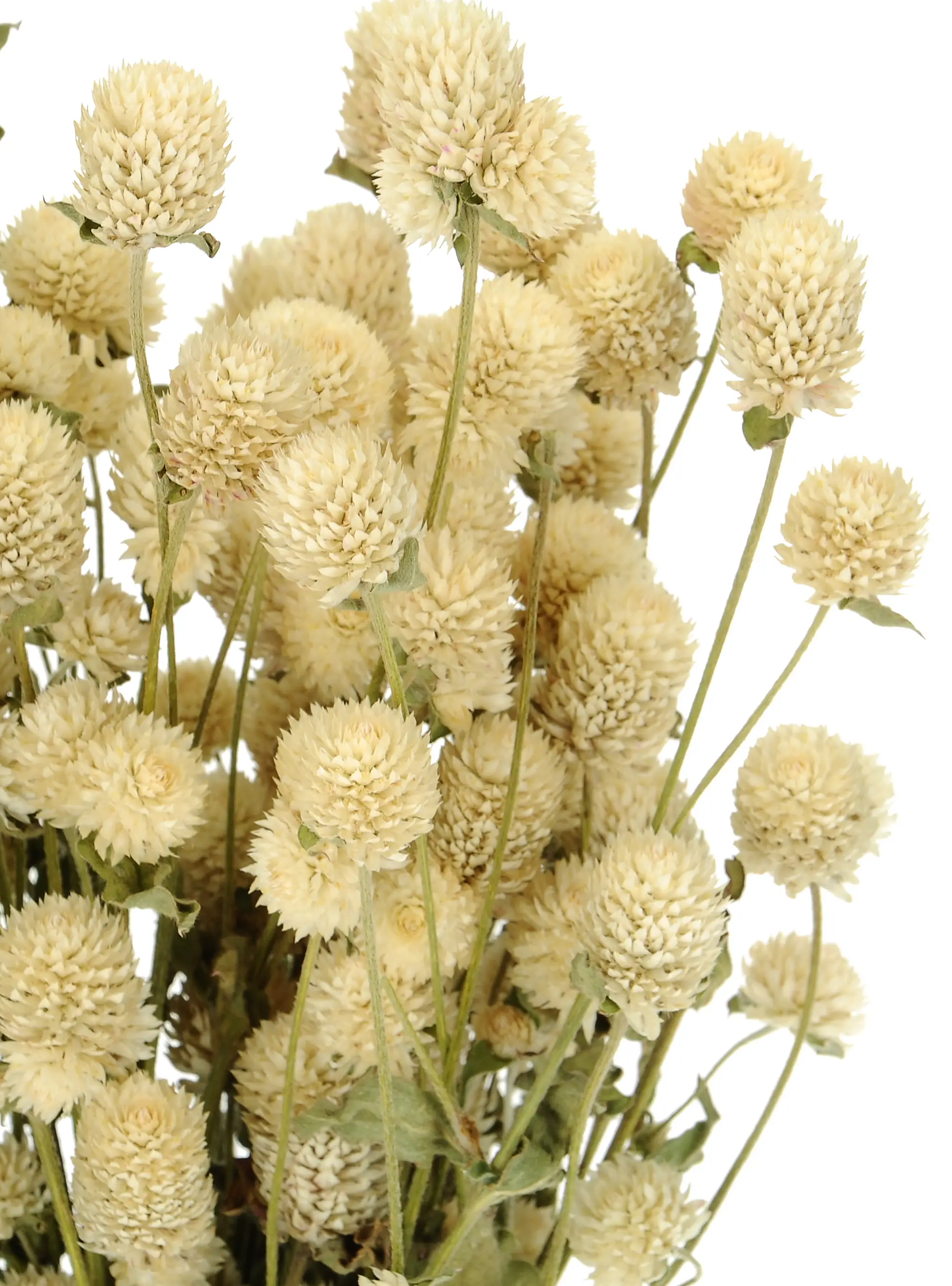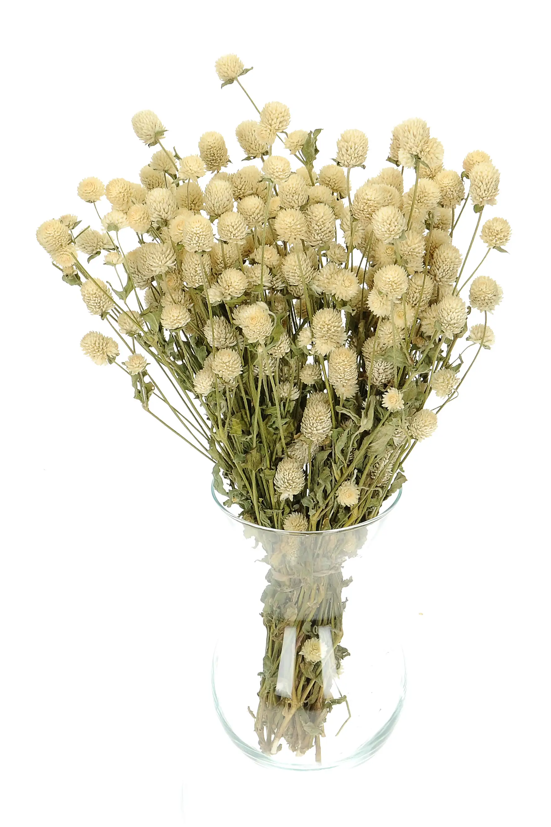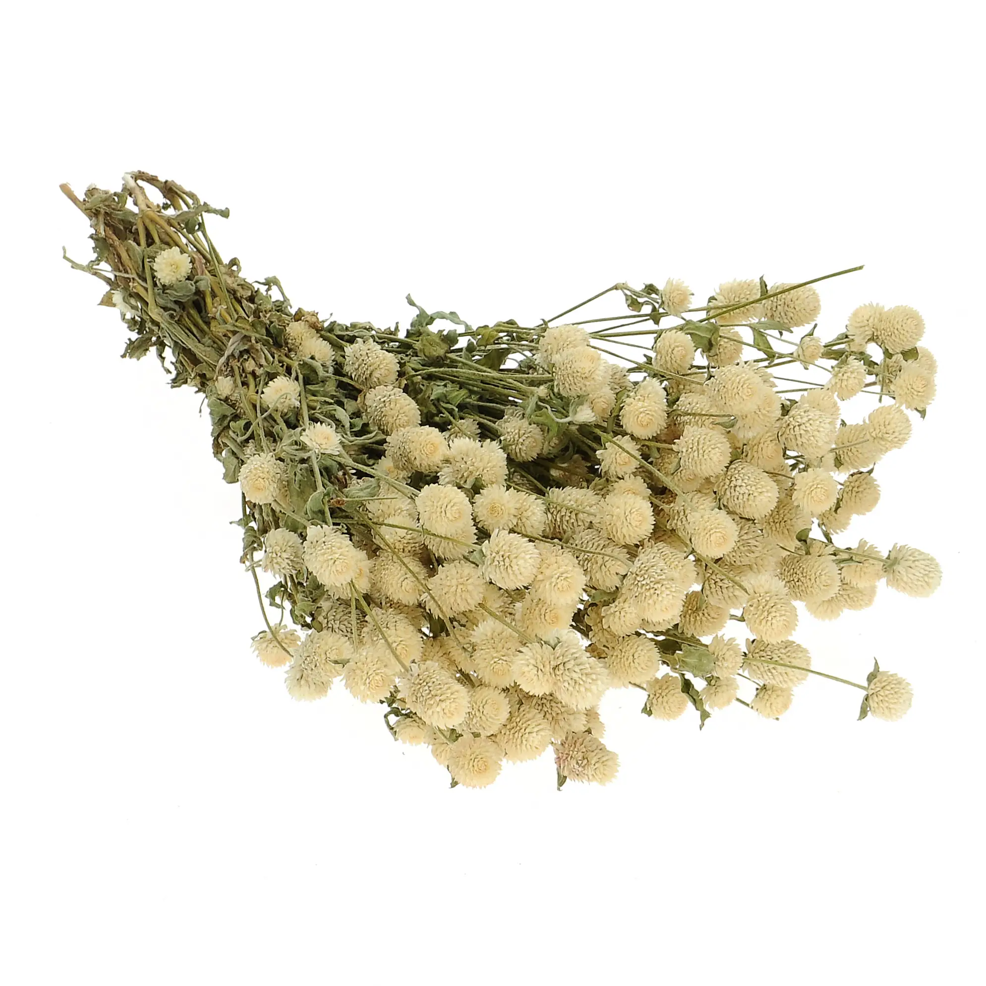 Gomphrena globosa - ein Strauß von Gomphrena polnischer Herkunft mit kugelförmigen Blüten in einer natürlichen Farbe von schmutzigem Rosa. Die getrockneten Nachtkerzen eignen sich gut für Trockensträuße, Girlanden, Ständer und Blumengirlanden.