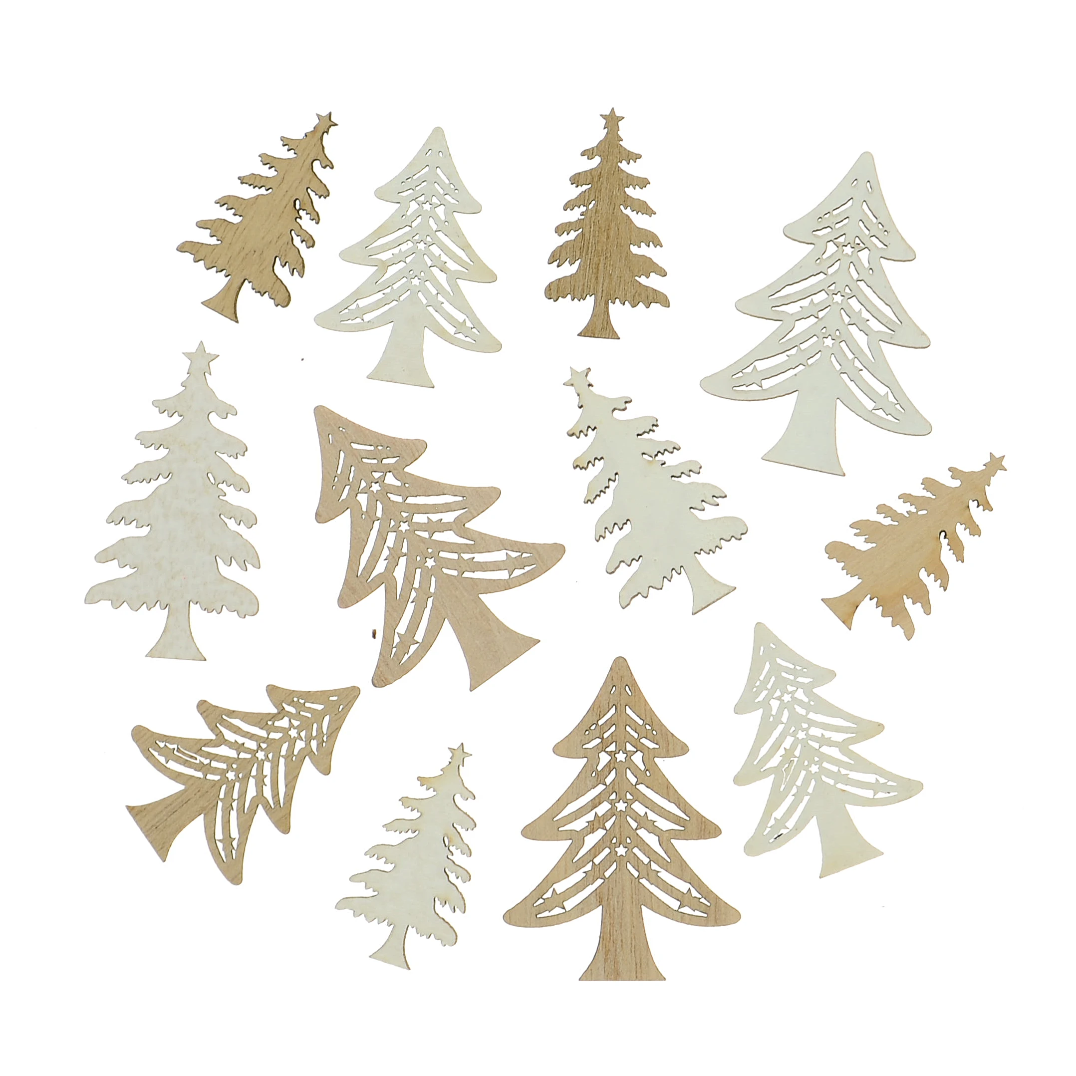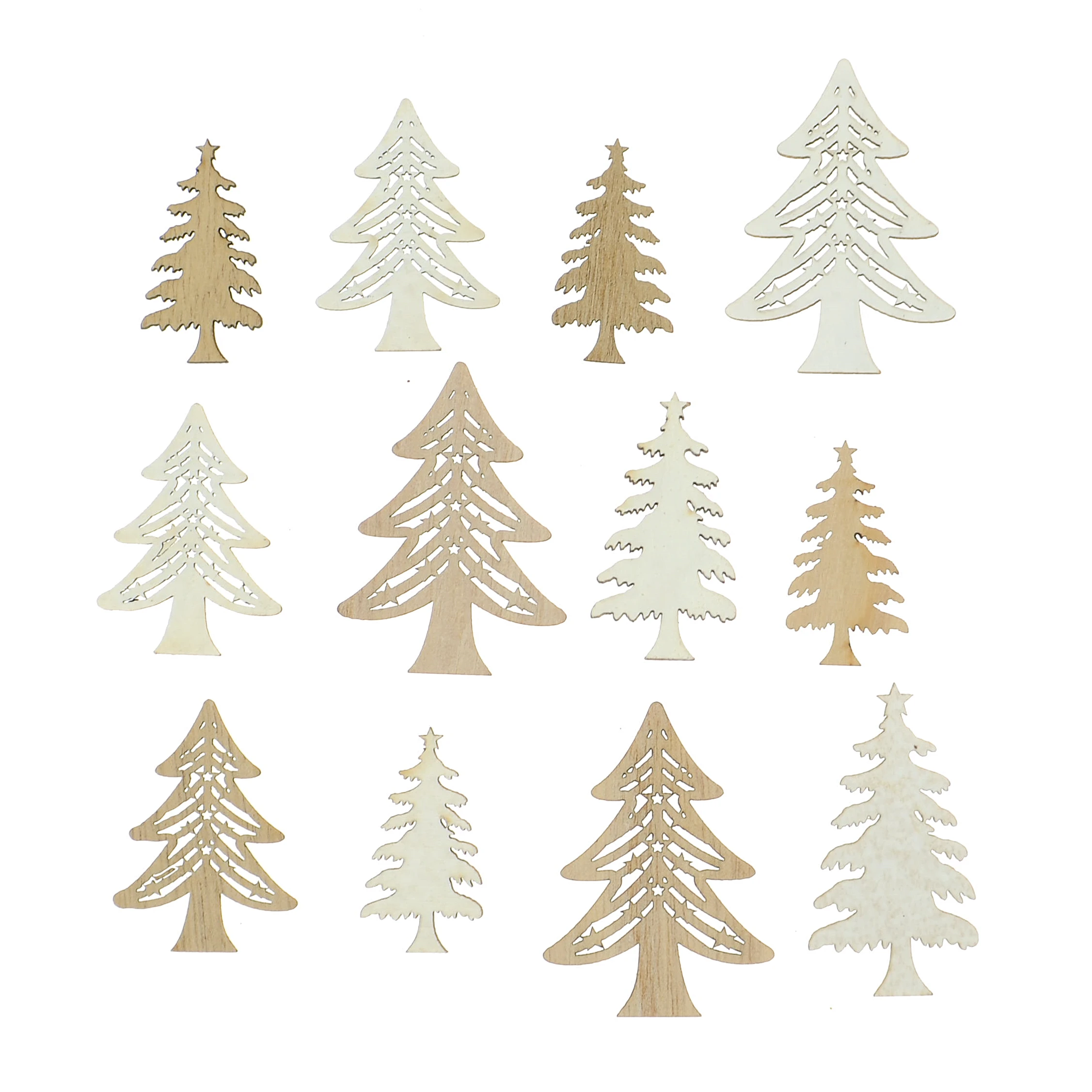 Set mit 12 Weihnachtsbäumen aus Holz für die Dekoration. Jedes Set besteht aus zwei Farben von Bäumen - weiß und natur. Die Hälfte der hölzernen Weihnachtsbäume hat ein durchbrochenes Muster und die andere Hälfte eine glatte Oberfläche. So können Sie eine Vielzahl von Weihnachtsdekorationen kreieren.