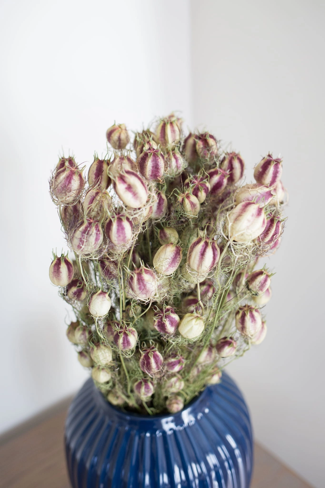 Nigella damascena - eine Pflanze mit einzigartigen, kugelförmigen Früchten von grün-violetter Farbe. Ein Strauß aus getrockneten Nigella ist so originell, dass er keine zusätzliche Dekoration benötigt, sondern einfach in die Lieblingsvase gestellt werden kann. Die Nigella-Früchte können zur Dekoration von Girlanden, Schilf und zur Herstellung von selbstgemachtem Potpourri verwendet werden.