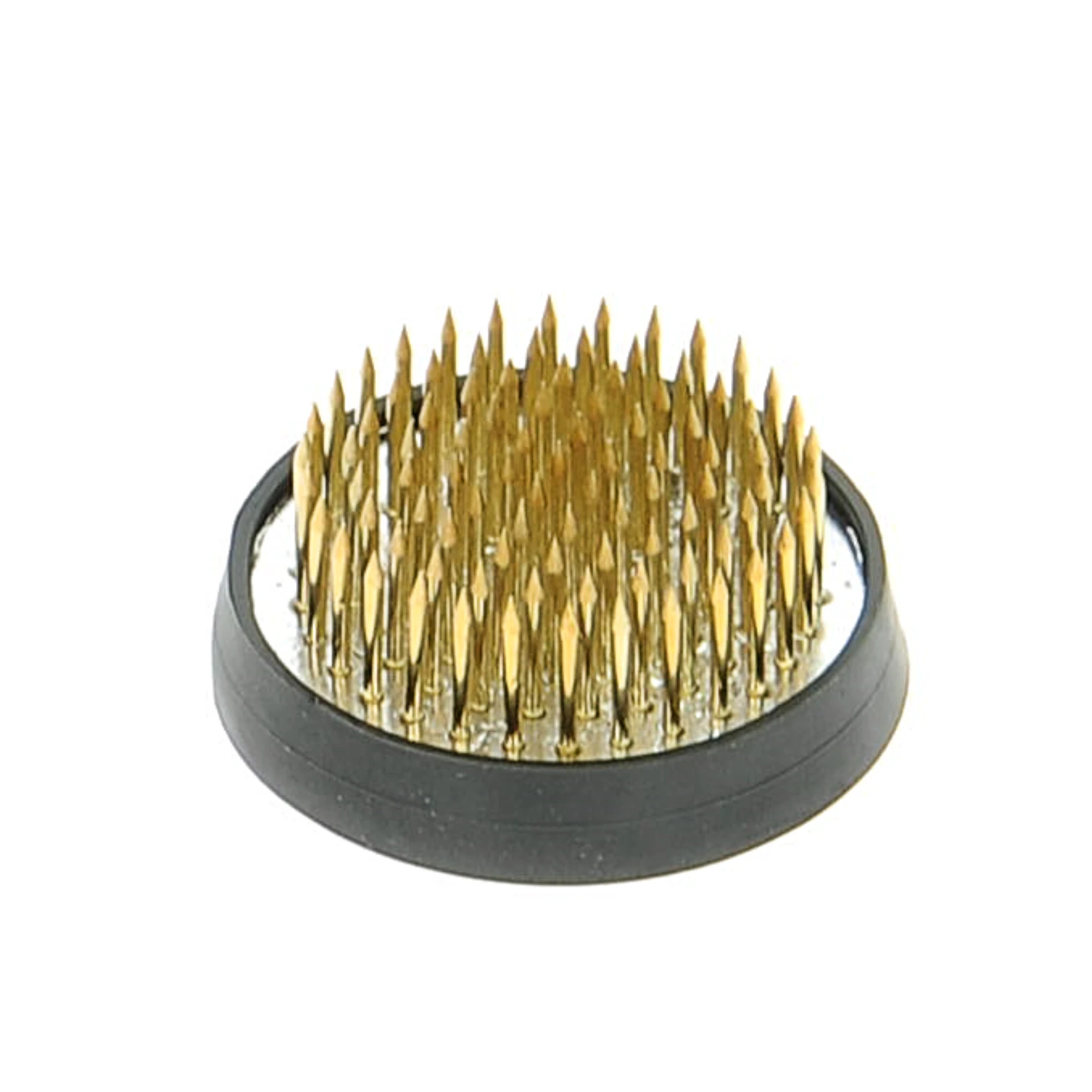 Ein runder Kenzan für Ikebana - die japanische Kunst des Blumensteckens. Dieser traditionelle Ständer eignet sich sowohl für Schnittblumen als auch für verschiedene Arten von Zweigen. Der Metallsockel ist mit 91 scharfen Messingspitzen versehen. Der Kenzan ist mit einem Gummiring befestigt, der das Verrutschen der Komposition verhindert und das Gefäß vor Kratzern schützt.