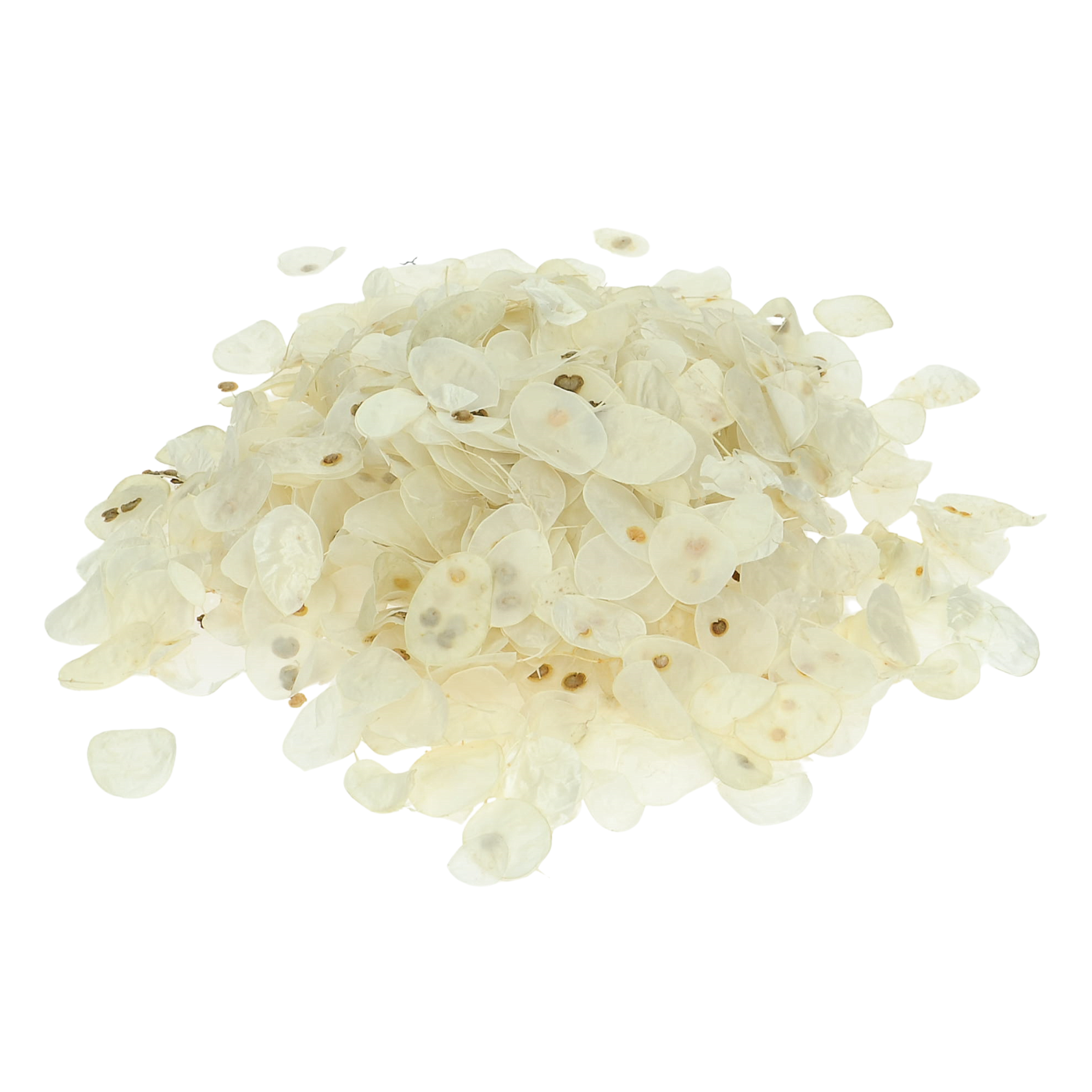 Lunaria annua - eine der interessantesten getrockneten Pflanzen. Ihre weißen und manchmal silbrigen, blütenblattähnlichen Früchte verbergen im Inneren Samen, die sogar mit bloßem Auge sichtbar sind. Lunaria mini ist eine niedrigere Version dieser Pflanze.