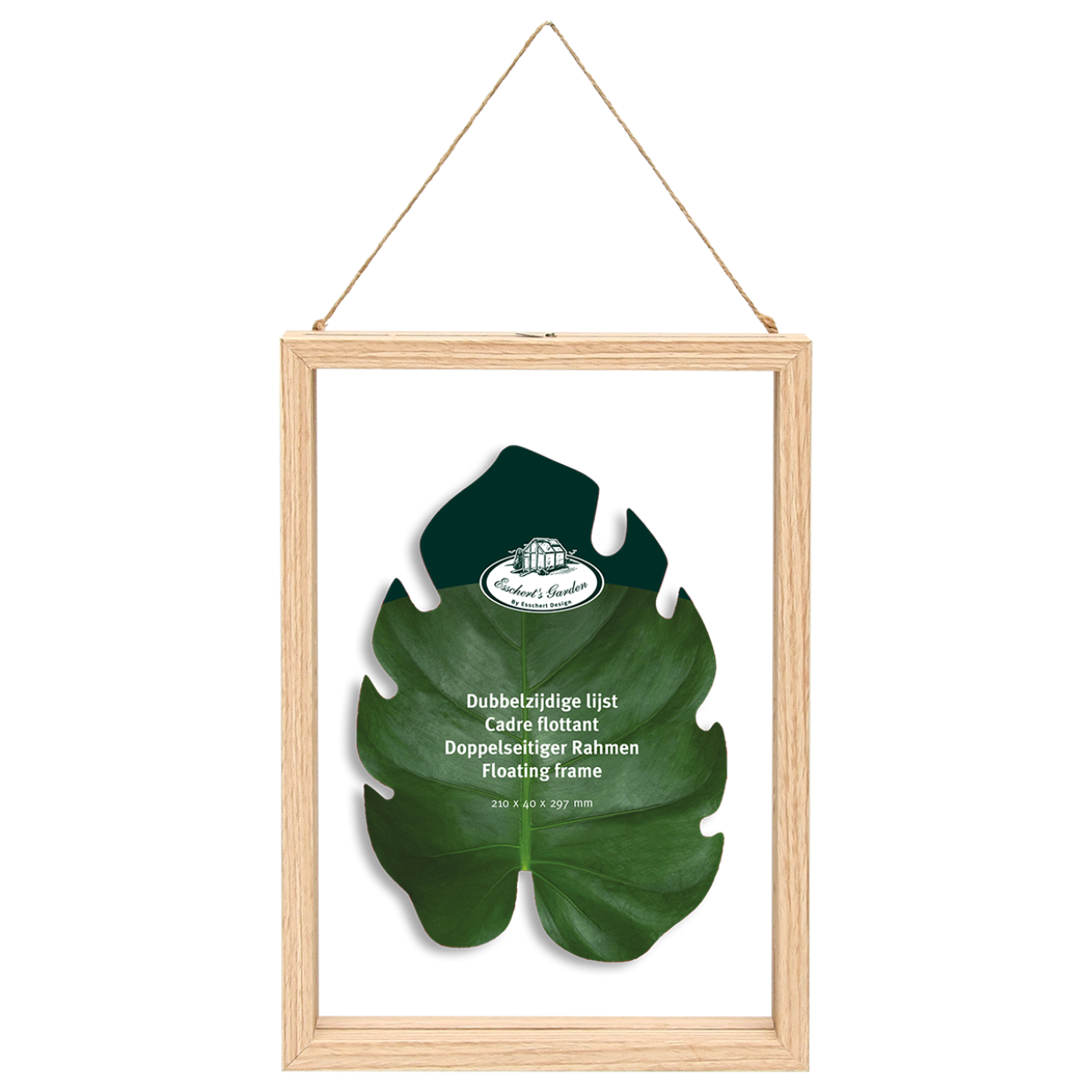 Der Rahmen für Trockenblumen, der so genannte floating frame, zeichnet sich durch Doppelglas aus, zwischen das Blätter, Trockenblumen und andere flache Dekorationen gelegt werden können. Der Rahmen ist aus Kiefernholz gefertigt. Der Rahmen hat eine natürlich wirkende Schnuraufhängung.